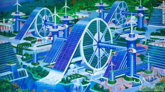 未来世界的锥形建筑群:这看起来像是一座座树立在乡村地区由钢铁和玻璃架构的山峰。