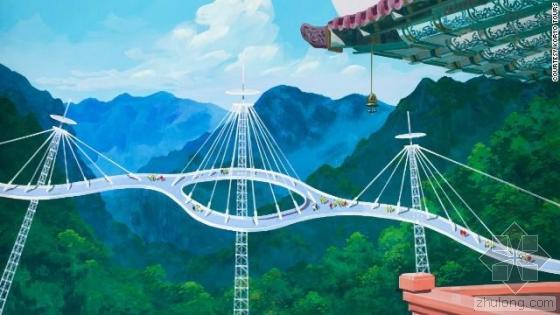 结合了旧式设计条件和新式设计理念,图中展示了连接在朝鲜妙香山各个山峰间的人行天桥。