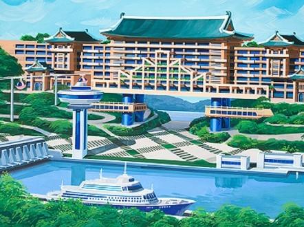 样图中的部分设计远远脱离了现实基础,相比已建成的建筑有了巨大的飞跃,但建筑师们相信这在未来是可能实现的。上面这张照片展示的是建在南浦港口西海拦水坝上的一家酒店和一艘豪华游轮,而目前该地区并没有完备的住宿设施。