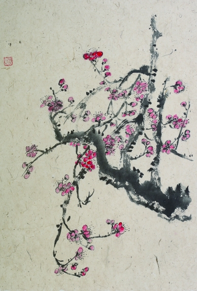 面前是两幅彩墨小品。一幅是梅花,奇崛苍劲的树干与鲜艳娇嫩的花朵相映成趣(左上);另一幅是花鸟,树枝点染掩映之下,两只禽鸟颇有神趣(左下)。这两幅画轻抹淡绘,一股清新和书卷气扑面而来。
