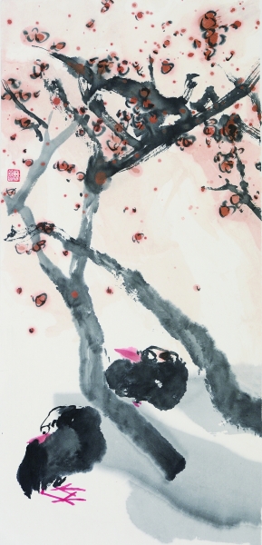 关注他的绘画,始于一年前我们的微信交流。他在微信上上传了他的《红梅报春图》,枯枝红梅,傲然盛开,两只衔春而立的鸟儿,已然感觉春光来临,那么舒展、悠闲而快乐。这既是对春天的歌唱,也是他心境的写意。为此,他还配上了诗文:“那月/青春如船歌/乃一声/泼剌剌跃上心头/离了喧嚣/抛了闲愁/看彩云追月/听水荡兰舟。”诗情画意,尽在其中。他的另一幅画,画的是两块顽石,几茎乱竹,疏密有致,那两只鹌鹑安闲于角落,题曰:“琴瑟在御,莫不静好。”我揣摩他的画意,他告诉我,“明白什么是不要的,就同幸福相伴而行了。”一语中的,我豁然于那风雨之竹和顽石的冰冷,如得一种醍醐灌顶的明示。