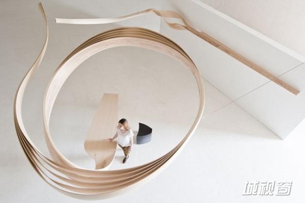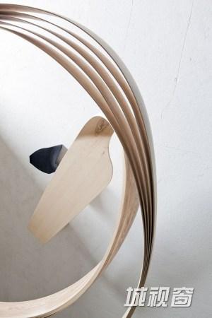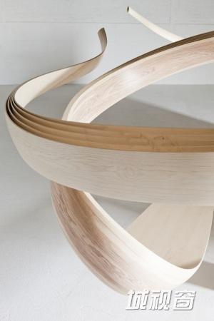 为了在视觉上营造清新靓丽的感觉,设计师采用多层白蜡木作为这个作品的制作材料,我们从头到尾都可以看到这个作品在木色中泛着白光,在白光中带着木色,非常曼妙的色彩组合。