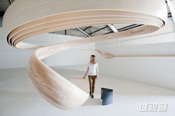 这个作品的外观样子也十分有意思,它从地面的桌子作为起点,然后成螺旋状上升,对,就像我们开车时候看见的那些高架桥一样,一层层螺旋上升最后上升至天花板,然后结束在墙壁的搁架。而且在同一平面上还有多层木板设计,视觉效果震撼。
