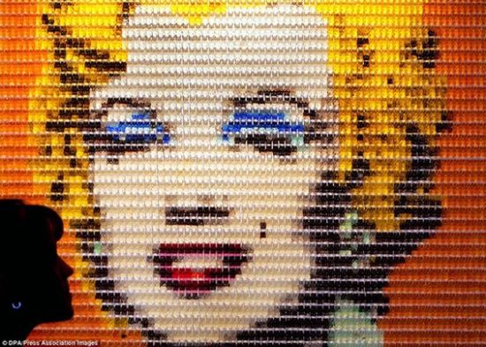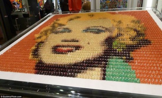 据英国《每日邮报》12月24日报道,现年57岁的德国艺术家考迪斯完成一件作品通常要使用数以千计的橡胶糖。就是通过这些色彩斑斓的橡胶糖,考迪斯为我们展现出玛丽莲·梦露、蒙娜丽莎、肯尼迪等人物的形象。其中,仅玛丽莲·梦露的肖像就耗费了3200颗糖果。