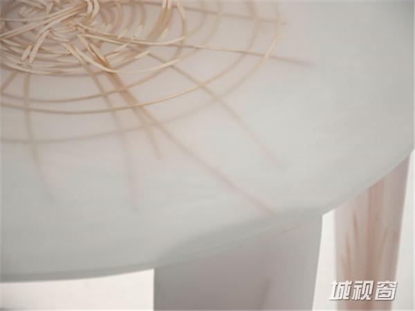 开始试验的时候,设计师 Wiktoria Szawiel 只是将不同种类的花草和植物浇上树脂,制造的样件类似于化石。最终,设计师利用藤条、柳枝、木材编织成椅子、凳子等结构,将乳白色的树脂直接浇注到为椅子、凳子而专门设计的模具中,出模后再用砂纸打磨,我们就清楚的看到了这些相互交错的纤维图案。