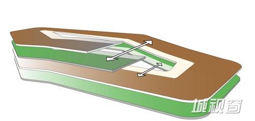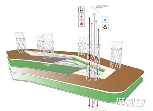 建筑的斜坡相互交织,将通过一系列的桥梁和通道相互连接,使尽可能多的行人交通。沿着坡道的商店置于首层,自由定制自己的前立面。这增加了一个有活力的设计。塔的支撑结构为六根钢管,还设有管道和电气工程服务于大部分建筑。