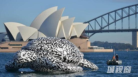 报道称,这只巨龟在悉尼港漂过悉尼歌剧院、港口,以及悉尼大桥。巨龟名叫“阿尔法”,高15米,其身上布满了黑白斑纹。