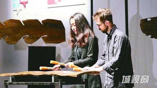 昏暗的大罐内,灯光聚焦于三件悬在固定铁架上的金丝楠木,形状有的似鱼骨,有的似波浪,有的像是在金丝楠木上开了一个个的小窗,如果此时还可以单纯以金丝楠木命名的话,那接下来就该叫它们“声音雕塑”了。巴塞罗那大学美术学院雕塑艺术系教授、声音艺术实验室总监马迪·瑞兹和他的助手,用手中的小木槌敲击金丝楠发出的声音,时而空灵、时而铿锵、时而清脆、时而沉郁,在场的每一位观众都屏住呼吸,仔细聆听其中的细微回转与这些声音和大罐碰撞产生的延续之声,这样的效果确实有别于一般乐器发出的声音,那么的自然、清新,金丝楠木仿佛瞬间就活了起来,因为声音而具有了生命。