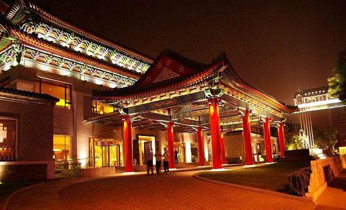 建筑体量由北向南逐渐提高,主入口为一层,大堂及其它公共区域为两层,南部的客房区为三层。建筑群规划及建筑设计主创建筑师为北京市建筑设计研究院主任建筑师刘方磊 林红。建筑造型主要以其传统造型的大屋顶来体现整个建筑的传统信息。墙身材料的选定以体现现代风貌为初衷,细部处理上体现传统的设计规律。各个带有传统形式大屋顶的单体通过6m×6m的玻璃通廊彼此联系起来,形成完整的院落,既保证各个区域通达的顺畅,又为建筑造型带来别样的感受,让客人透过现代的建筑材料欣赏到传统建筑的细部,让人仿佛流连在早已逝去的却又令人向往的年代中。