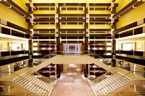 在总平面的布置中,建筑沿南北向设置主轴,该轴成为客人行为的主要流动方向,建筑沿此轴东西对称。自然围合出的四个庭院采用了与四合院的庭院空间相一致的内向性庭院。主要出入口设在北面,面朝金宝街,大堂、酒吧、展厅等公共活动区布置在用地北部,客房区布置在南部,做到动静分开。