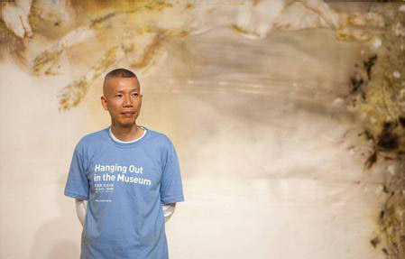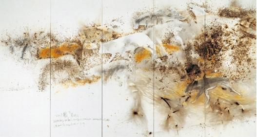 在西湖平台上完成的《西湖》已经变成一幅360度的巨型环形作品,悬挂在浙江美术馆最大的展厅里。那几十种大大小小的火药已经化为柳树、古塔、远山,一个浩渺空灵的山水世界。西湖四周起伏蜿蜒的山峰错错落落、若有若无,火药在丝绸上爆炸出淡如烟丝的墨痕,有些地方淡到不可见。