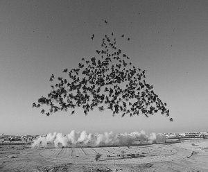 一位工作人员推着装了20多罐火药的小推车跟随蔡国强又高又瘦的身影,罐子里的火药有粉末状、米粒状,或者大一点的小圆球、小扁块,大部分是深黑的颜色,撒在洁白的丝绸上,如同一幅黑白水墨画。那天西湖上的风很大,火药撒下去,不时扬起一阵黑尘。平台上方,用来航拍的遥控小飞机在空中呼呼地盘旋。
