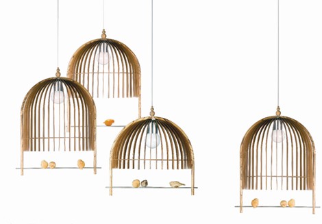 鸟笼灯:利用传统鸟笼重新进行组合的结果。最有意义的是让鸟笼成为灯具,具有功能,又赋予了人与自然和谐的意义。鸟不再被关在笼子里,人类为它提供了一个自由的空间。