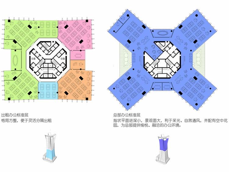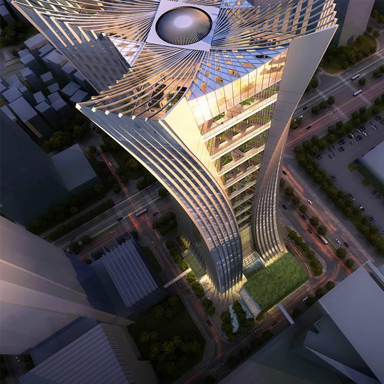 大厦上部的25个楼层是鼎和保险公司全新的旗舰总部。设计采用混合通风系统,扭转的楼板则更好地迎合风向。在大厦外部,每隔三层即设有一个“空中花园”,既能让大厦中的人员欣赏到绿色的美景,又可为下层遮挡阳光,使办公空间获得最佳的采光效果。总部以下的17个楼层作为办公用房出租,舒适的办公环境必定能获得承租方的青睐。