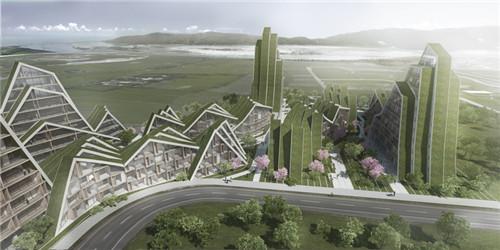 该设计以带状形态创造出了一座商业空间与居住空间构成的台地,其形态与远处的自然山脉相互呼应,表达了该设计对于周边自然环境的尊重和参考。带状区域呈东西走向,以保留最好的景观视野,同时自身也为台湾潮湿而炎热的热带气候提供有效的荫蔽。低角度、高亮度的朝阳和落日被带状地区不遗余力地遮蔽,而为人所欢迎的南北向日照则穿透至建筑单元之中。绿色屋顶进一步发挥了散热的作用,并与带状地形共同构成了低能耗的总体规划。