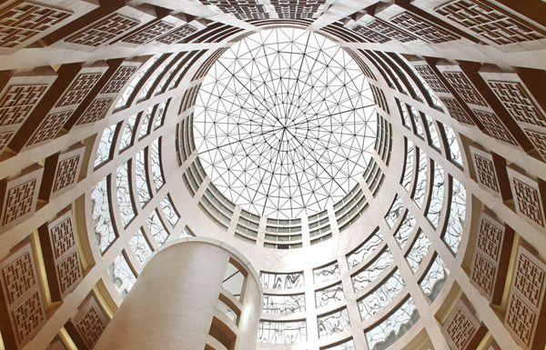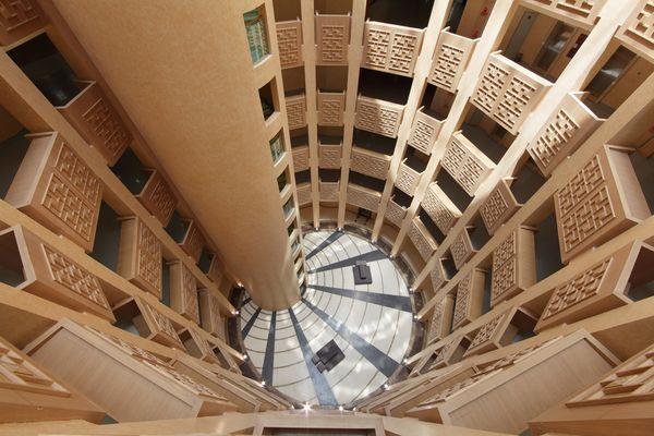 借鉴路易•康的理念,我们问了类似的问题:是什么构成了理想的大学图书馆?除了提供空间来阅读和学习,我们希望同时提供空间用来会面和交流。圆形中庭提供了一个理想的邂逅空间,使用者通过这个空间到达图书馆的不同区域。圆形中庭的玻璃穹顶为这个空间提供了充足的自然光线。