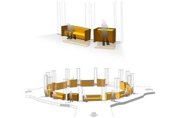 为了仍然满足圆形中庭作为交流和主要交通空间的功能,我们在环绕着每一层中庭空间的立柱之间设计了高靠背的座位和类似讲台的阅读桌 。高靠背的座椅面向走廊,使用者在这个半私密的空间阅读或交谈,同时可以沐浴中庭射入的自然光线。类似讲台的阅读桌则面向中庭,使阅读者面对着竖向贯通着10个楼层的中庭空间,就像在进行一场气势恢宏的演讲。这些家具设置,为图书馆的使用者提供了空间来停留、偶遇和交流。这个循环功能的空间因此成为了一个目的地,而不仅仅是一个单一功能的过渡空间。