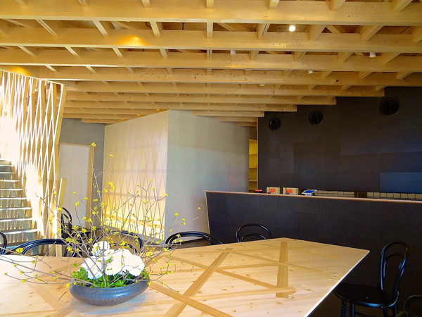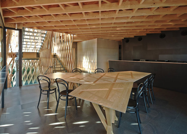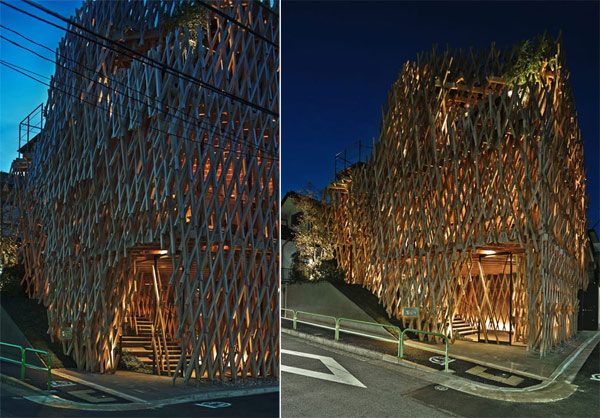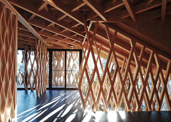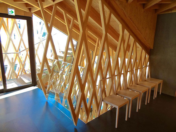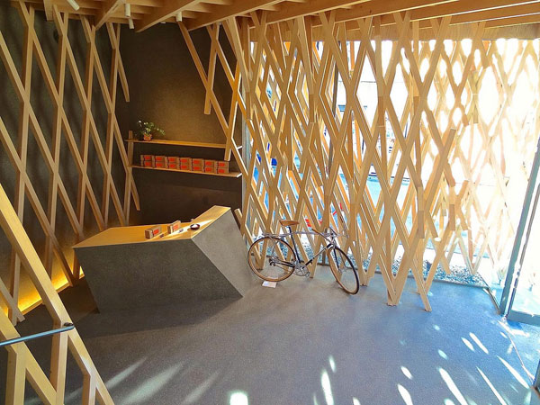 这种建造技术经常应用在“shoji”上——日本木建筑使用的纸糊木框——隈研吾用这种木结构搭接了一个窗格条网络,将297 m2的空间包围住。通常,两块木条交叉会形成二维结构,但在包裹整个立面的过程中,建筑师将60mm x 60mm的木框结合成三维组件,相互之间形成了30度角。木网格让阳光自然地照射进室内,同时还提供了必要的私密性。