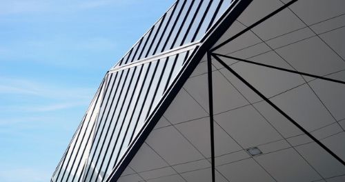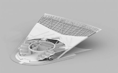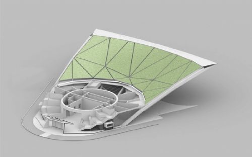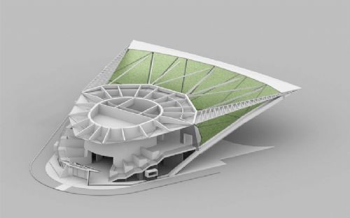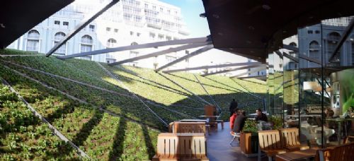 另外几侧被水池包围,形成了统一的城市景观。从另一侧进入建筑后,顺着大楼梯逐渐向上,楼梯的休息平台处也作为用餐区。置顶之后会被眼前的绿色大坡地所震撼,让人意想不到的空中花园来自悬挑部分的建筑屋顶。既然地面的空间留给了城市,那么空中的精彩当然要留给建筑的使用者。