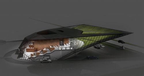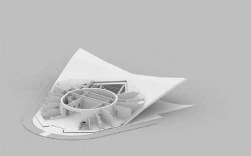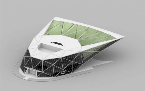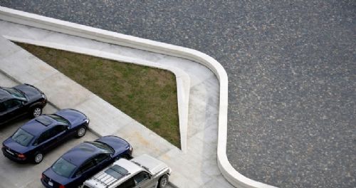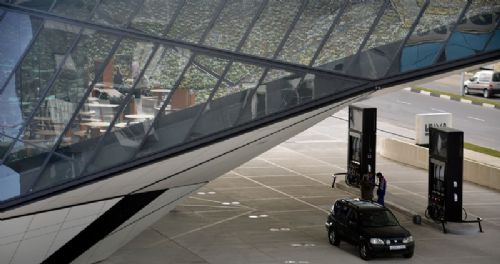 建筑的平面形式类似一个大铲子,沿路的一侧具有很长一段的悬挑空间,那里作为加油站,将更多的地面空间还给了城市,同时为加油的汽车门提供了一个遮阳避雨的大屋顶。(是不是比我们的红色大方顶艺术多了~~)
