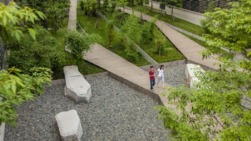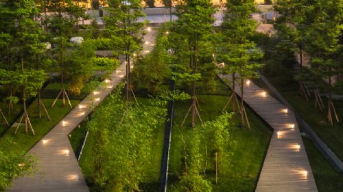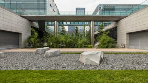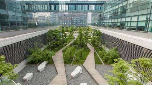 景观设计形成了织锦似的景观效果,将公司各个建筑相互联系,并且形成了城市中的绿洲。