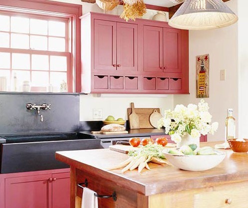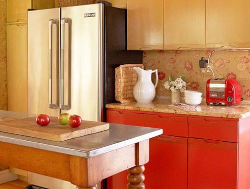 红色可以增加人们对食物的需求,让整个烹饪过程都充满热情。厨房角落里点睛的红色厨柜是厨房空间里浓墨重彩的一笔,在碎花壁纸的映衬下,厨房也展现出其娇美的一面。