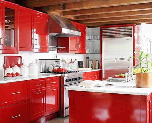 家装厨房设计效果图:高光的涂料让红色的运用过分亮艳