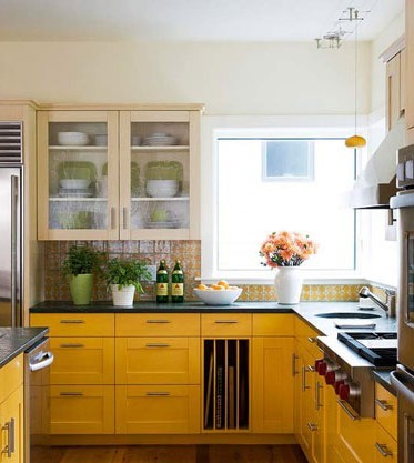 家装厨房设计效果图:亮黄色的厨柜十分抢眼