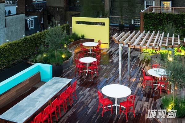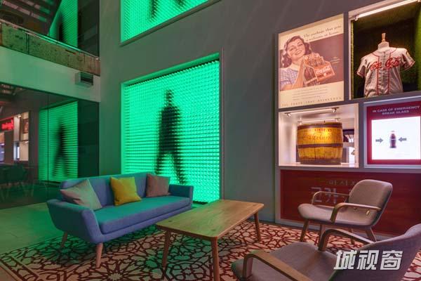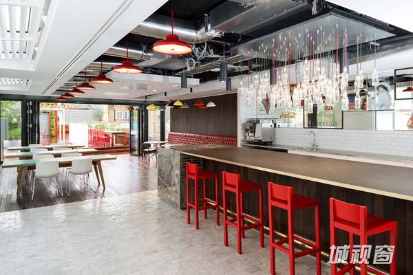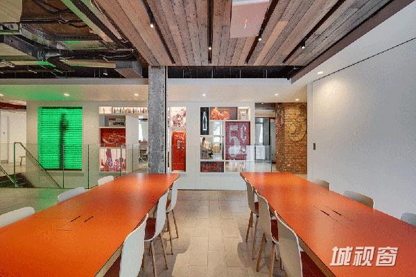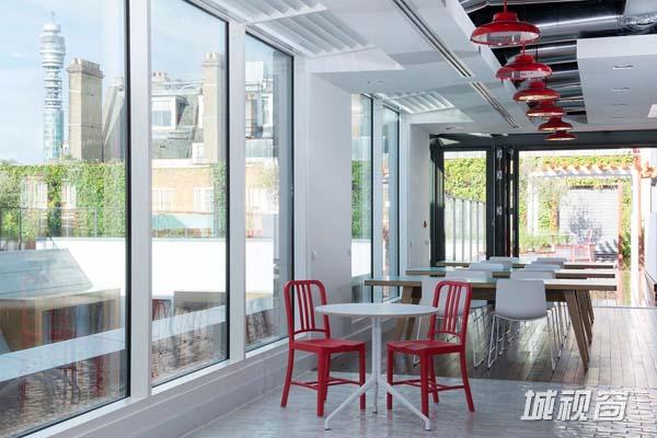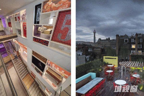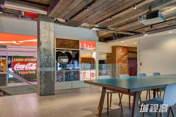 这栋四层楼高的建筑物,原属于1920 年代爱德华巴洛克式的古建筑,建筑师为顶楼的露天阳台打造成为一个摩登的开放式空间,内部空间更有咖啡厅、供应热食的设施、大型会议室,以及不可或缺的 meeting rooms,而各种复古造型的应用不忘提醒大家这栋老建筑的重生印记,像是吊挂在天花板的玻璃瓶灯具、强烈大胆用色的霓虹灯招牌、仿红色砖墙的壁面规划,加上展示Coca Cola 历史演进的展示墙面和放置档案的背景架柜。除了硬体设施之外,工作空间的规划也是井然有序,搭配上柔和的灯光,细微之处中更可看到品牌标志的mark,更是壮大了企业精神的延续和传承感。