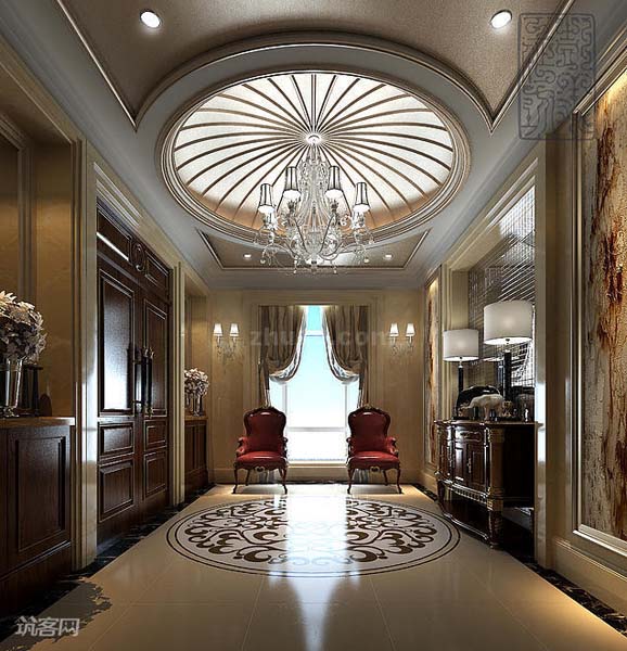 【门厅】这里是本案别墅的出入口处,进出一打眼就能感受到这里典雅、明亮的华彩。对开的实木大门闪耀着绸缎般的色泽,吊顶与圆形藤蔓纹饰地板相互呼应,上下统一为一体,光可鉴人。一侧边柜上陈列有两盏白色装饰台灯、窗边对称排放两把红色座椅。