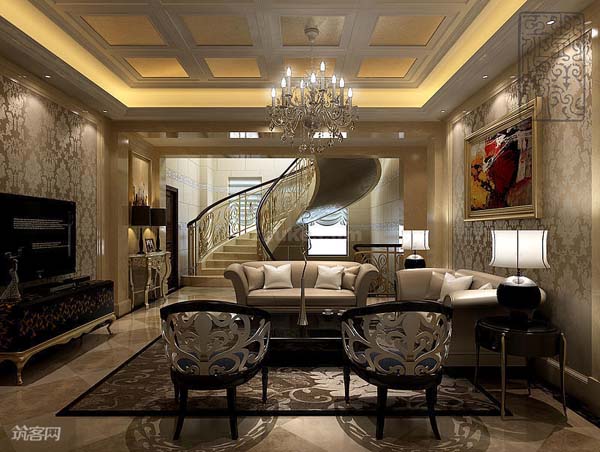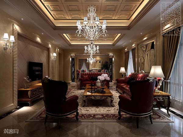 【客厅】暗红色的欧式沙发和单椅是此别墅空间的主调,搭配曲线优美的茶几和边柜,典雅尊贵。上部浅金色的吊顶,犹如两板巧克力的造型,正中都是一盏水晶吊灯,而环绕四周的还有多盏壁灯,更显大气。