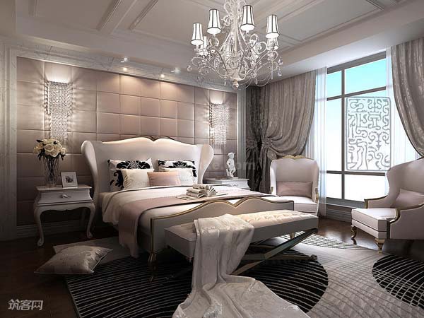 【卧室】尽管别墅空间整体呈现带有浓郁欧式的新古典风格,但不乏简约而优雅的简欧与现代元素散落其间,轻重缓急的变奏。有白色纵深有拉抻空间作用的顶板,浅色的墙壁,黑白灰的地垫,还有以白色为主、床饰点缀金色靠枕床旗的大床。