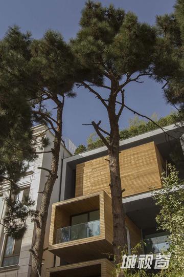 迎面而来是一棵棵参天大树耸立于建筑门口,斑驳的树影与天台小树相映衬,同为建筑遮荫美观的同时,还和外立面上的原木材质相融合,传递可持续发展的设计理念。