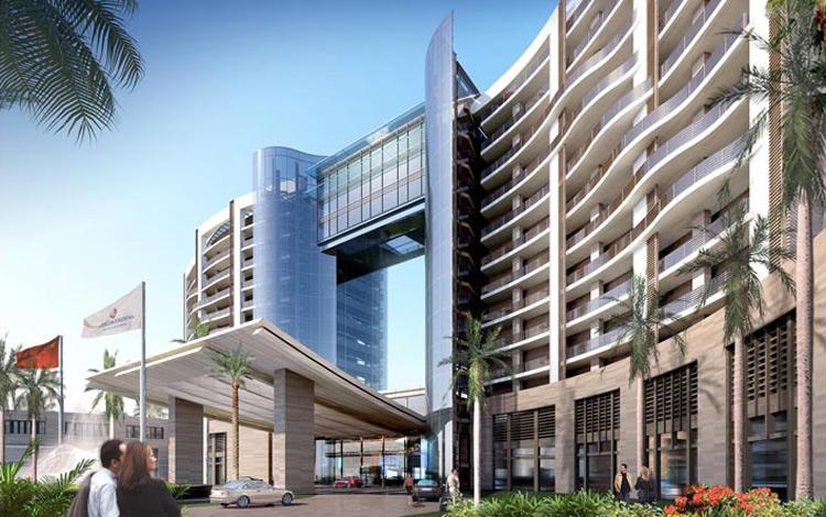 我们的设计灵感来源于“鲤鱼跃龙门”这一吉祥的传说,两座透明的观景电梯构成“龙门”, 设计成波浪状的豪华大厅载着跃龙门的“鲤鱼”,涌入张开双臂的客房翼楼。