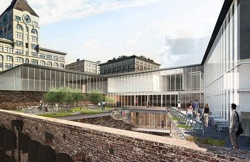 Studio V Architecture建筑工作室投资1.5亿美元,将其翻新使之再次成为城市的活力所在。国家公园服务列出了七个建筑为历史遗址,这意味着改造翻新这些建筑将必须履行严格的标准。该工作室负责人杰伊Valgora说表示:设计保留了原来的外观设计,并使用了较为古朴的颜色和材料,并在其外幕墙涂上了具有现代气息的光泽。另外,设计结合了历史特点和现代特点,使用了玻璃屋顶以便于自然光线和空气进入室内,并使曼哈顿可以一览无余。而且,该建筑材料质量已经达到了LEED银级认证。