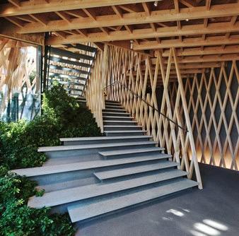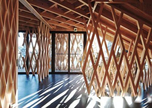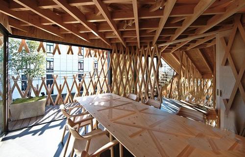 所以建筑师仿照一个精心制作的竹篮子来塑造建筑的外观。超过5000米长的木头条被用来构造精确的3D网格,环绕在三层楼的外墙壁和天花板周围。木条长短不一,以便露出多层和减少总体线性。