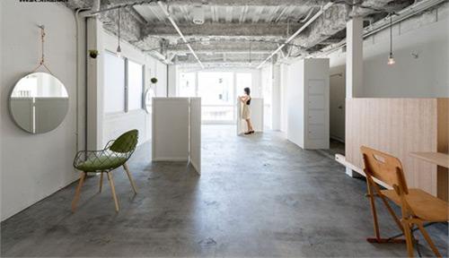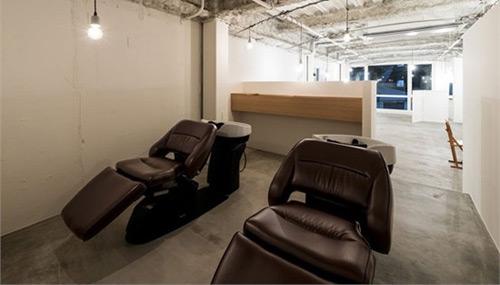 便这个空间看上去显得比较空荡,但各部分的区分还是非常明确的,入口、接待室、等候室、洗发、做头发的空间一应俱全。做头发的空间作为主要的区域,确保了椅子的间隔和员工的活动路线足够宽敞。为确保顾客的空间,该区域拉起了一个中高度的屏风,给顾客提供了一个相对私密的空间。上方垂下的一排灯泡,提供了美发时需要的光照,营造出柔和的光线。等候空间怎是将一块看似没有生机的区域有效地活用,利落的台面方便了人们在此做自己的事情。美发沙龙内(包含接待室)的家具,着重使用原木色调,并在木料上涂以清漆,让空间的整体感觉统一到无饰状态。水泥与木材的组合给人凉爽且雅致的协调印象。从柜台台面的原木色,再到天花板处的灰白色,都应和着沙龙的主题--原色。洗发空间对于客人来说应该是这里最舒适的场所了。从舒适的深棕色沙发躺椅上,我们可以寻丝逐迹发现这里的些许高端感,区域上方垂下的探灯便于发型师查看顾客头发的色彩,一张较长较高的台面,也巧妙地将这里与其他区域间隔开,围合成一个半封闭的状态。