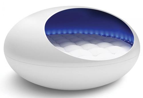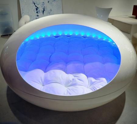 这款名叫Tranquility Pod 的水床外观像一粒巨大的曼妥思糖,这张六英尺(1.8米)宽的八边形水床上,环绕LED情绪灯,周围是80瓦功率的音响系统,一旦趴在这张舒服的大床上,你绝对不愿意再离开。