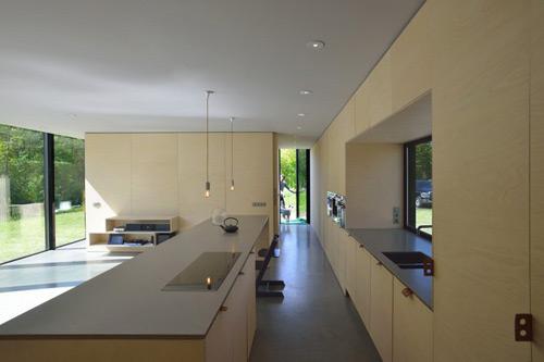 玻璃屋这一个私人别墅设计,幕墙完全由反射玻璃构成,这层玻璃形成了对内部设计的一个隐蔽和保护效果。平面布局尽可能采用密集型设计,并将差异性的生活方式尽可能考虑在内。在和客户沟通后,设计团队决定最大化地创建一种无障碍的房间设计方式。轻微抬升的地板设计、滑动门、内装式厨房都在同一个空间中从而增强了人们的观赏视野。长条状布局拉伸了整个房间内部的观赏视野,并且和绵延的森林形成一致。室内的所有墙面都用桦树复合面板粉刷,相对明亮的色彩与严肃冰冷的玻璃幕墙形成强烈的对比。
