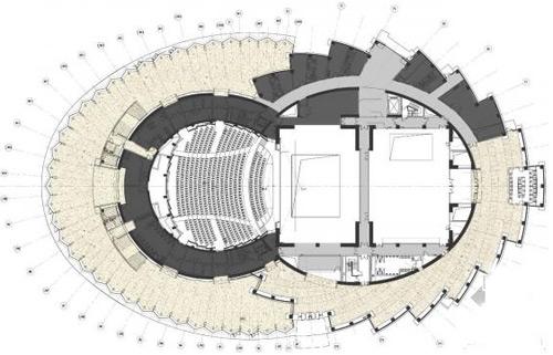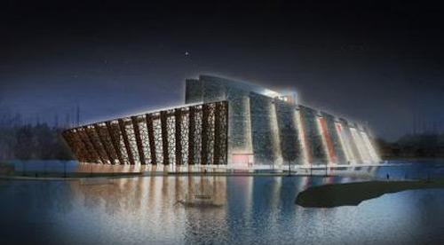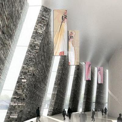 这是由大元建筑及设计事务所设计在建的位于乌镇的剧院项目,这个项目的最大挑战是设计一个足够大的建筑,以容纳两个剧院,分别容纳1200人和600人,同时两个剧院背靠背紧紧相连,还要具有现代的功能,与这个小小的江南水乡相匹配。设计师采用了双莲的隐喻,它们完美生动,共享同一个底盘,包含两个椭圆形的相互交织的形式,一个是透明的一个是非透明的。因为剧院旅游和文化双重功用,剧院的性质是多层次的。它可以进行舞台表演,先锋创作,时尚演出,会议,婚礼等等。游客通过木船或是步行来到剧院,右侧较小的剧院位于一个坚实的体量内,在这里像花瓣一般的由古老巨大的砖块覆盖的厚墙环绕门厅空间。左侧较大的剧院则由蜿蜒扇形的玻璃体覆盖,同时加入中式窗户的造型,它在夜晚闪闪发光,并倒影在水中,为早已梦幻的南方水乡又添浪漫。这个项目还包含一个对老剧院的翻修和对一个水上剧院的改造。