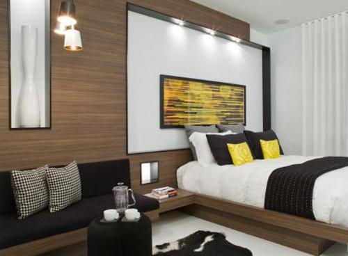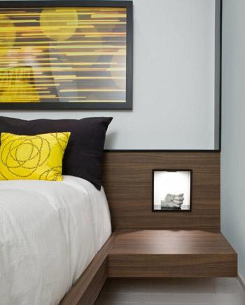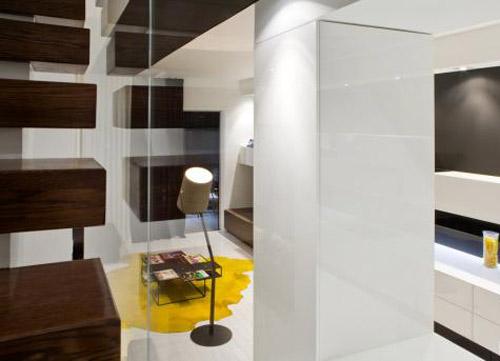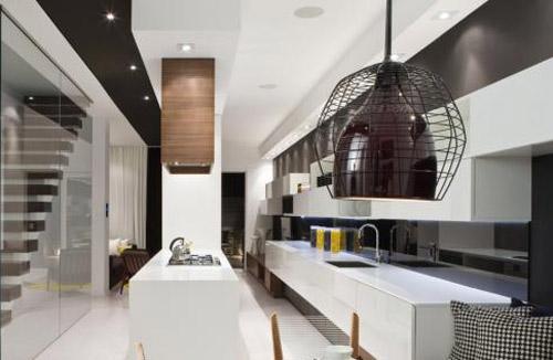 Trinity Bellwoods 联排别墅里面的其中一个单元由Cecconi Simone设计,位于加拿大多伦多,室内设计体现出现代风格。这幢联排别墅的三个单元宽度分别为4.1米、4.6米和5.8米。图片上所展示的是4.6米宽的单元的第一层和第三层,以白色、黑色、胡桃色和黄色为主色调。第一层就像是在机械工作的水车一样,仓库门随时都在开关,创造出一幅连续的虚实结合的水平构图。而楼梯、厨房的内置排气罩又创造出了垂直元素。厨房的Corian大理石吧台的零边缘设计、洗盘子的沟槽以及无光泽的防溅板体现出了精密的工艺。主卧是定制的胡桃木制家具,包括床、床头柜、沙发和放LED装饰的壁龛。加上Corian大理石的吧台和水槽等,整个设计十分华丽。