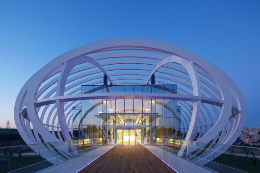 白色的椭圆形钢条围绕着整个建筑,形成了一个有机整体。依据一天中的不同时间,外部的钢条和包裹的建筑物形成了不同的视觉交互,牢牢抓住了人们的眼睛。白天,白色的钢条格外显眼,建筑物部分似乎是无形的,好像他们是在太空中漂浮。而到了晚上,当钢架上的LED灯点燃后,建筑物转换成一个光与影的雕塑,在黑暗中闪闪发亮,颜色也慢慢发生着变化。