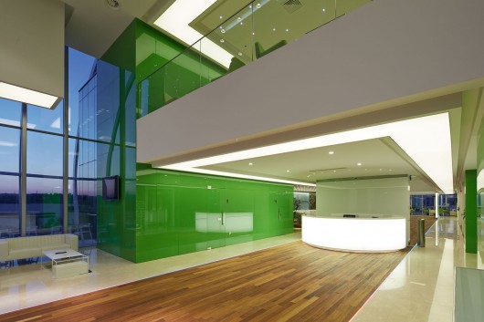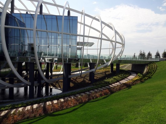 此外,大楼的外部覆盖着有反光的玻璃幕墙。该建筑物的下部,架设在一个暗黑色的池塘上。从远处看时,形成了一种升高的视觉效果。
