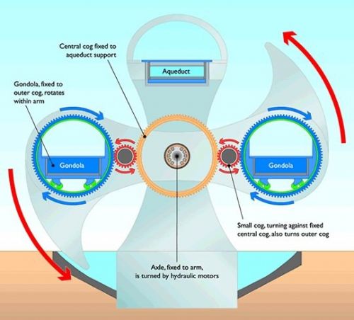 旋转轮体是对称设计,两边可以同时搭载船只和水槽进行提升/降下,轮体水槽内的感应器会自动计算进入水槽的船只和水体的总重量,以取得旋转时两方轮体的平衡. 比如,如果左侧的水槽内只有一只船,那么右侧的水槽会自动将水量调整至等于左侧船只+水体的重量,两只船的情况也是相同的.而升降的控制则是由轮体内的操作人员在电脑控制系统上完成。