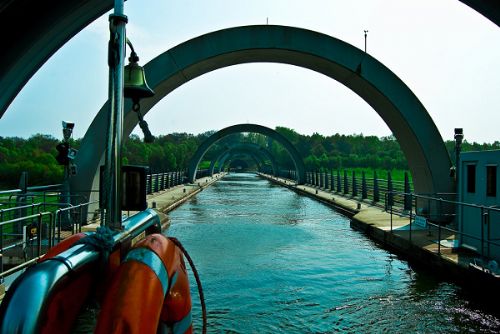 Forth of Clyde和 Union Canal间,因为地形差水位相差达33米.人们在这里建造了11段可调节式水道,缓和地调整水位差,船只就像搭乘电梯一样,分段地上上下下,要通过这11段水道,22个闸门,总共耗时要6个小时左右.由于过度耗费时间,这种水位调整的做法已经被荒废了近30年。