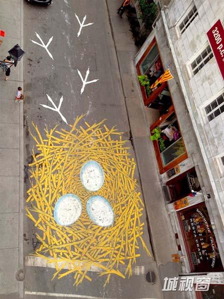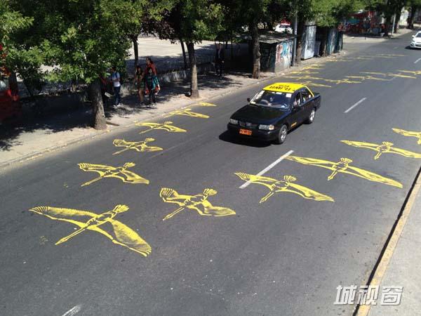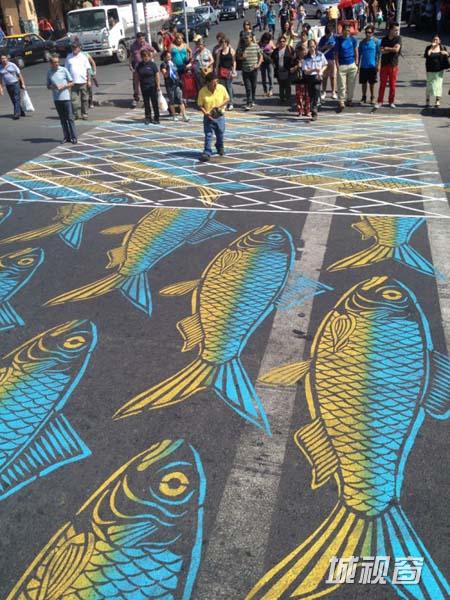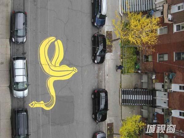 十年前,街头涂鸦并不被人们看好,因此彼得曾因在公共场所作画被指控53次。但如今峰回路转,他逐渐被人们熟知,这也算是为他的艺术创作开了个好头。之后,彼得开始在各个街道、人行道及停车场进行涂鸦作品的创作,完成后都留下自己的笔名“Roadsworth”。当然,除了在街头涂鸦,他也为展览、艺术节及市民们进行过涂鸦创作。