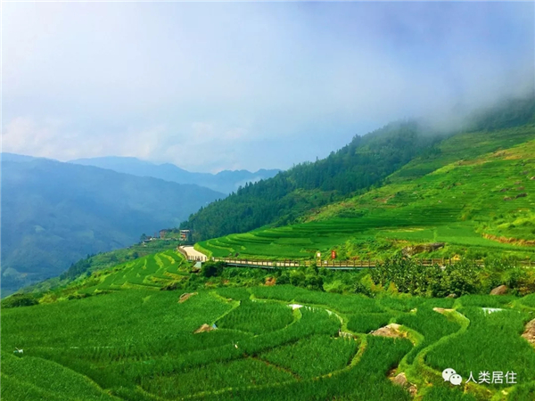 身处越城岭山脉西南麓,坐落于巨大山脊之间的龙脊村,距今已有430多年的历史。整个村落自上而下被垂直划分为4个壮族村寨:廖家寨、侯家寨、平寨和平段寨,房屋顺应山势却又不失秩序、错落有致地排列在梯田之中,形成森林-村落-梯田的有序布局。
