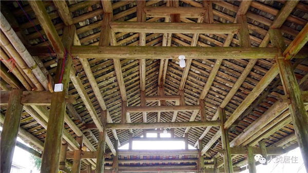 在山区复杂的地形中,干栏建筑可以架空跨越、依坡而建,可以挑出“吊脚楼”,丝毫不影响居住面,而且能节省土石方量,降低造价。干栏建筑也有利于通风,防潮除湿。除了“架空”外,龙脊古壮寨的建筑屋顶也很有特色。住宅屋面基本呈斜线,坡度约为30度,只在檐柱之外略有起翘,形成反坡曲线。龙脊地区的气候湿润多雨,为防止建筑被雨水侵蚀,住宅的出檐都比较深,高低错落的坡屋顶形成了独特的韵律美。