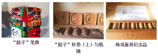 地戏面具作为人神角色转换的边界,历来被奉为神物。在屯堡,每个村寨地戏队在表演前,都要举行一个开箱仪式,通过一系列祭祀活动,来请出置放于箱中的面具,甚至在以往封建年代,女性是被禁止接触地戏面具的。然而,随着商品经济的发展,屯堡面具不再限于地戏神坛,更多地转变为装饰摆件,并且发展出了一系列以地戏面具为主题的创意商品,比如地戏面具柱、“脸子”笔筒、纸镇等。