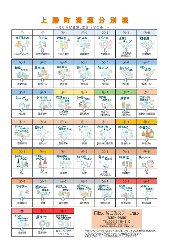 2002年起,上胜町将垃圾分为34种,从2015年开始增至13类45种。比如,金属有5种,塑料有6种,纸张有9种。进行焚烧处理的只有聚氯乙烯或橡胶等材质的垃圾,以及纸尿布、生理用品等极少量垃圾。